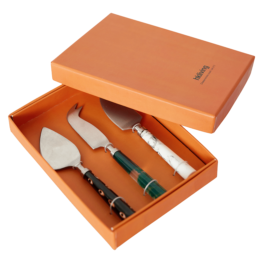 Een set van drie verschillende kaasmesjes, elk met een opvallend handvat in frisse Coast-kleuren. Elk mesje heeft zijn eigen unieke karakter en geeft uw kaasplankje een stoere uitstraling.