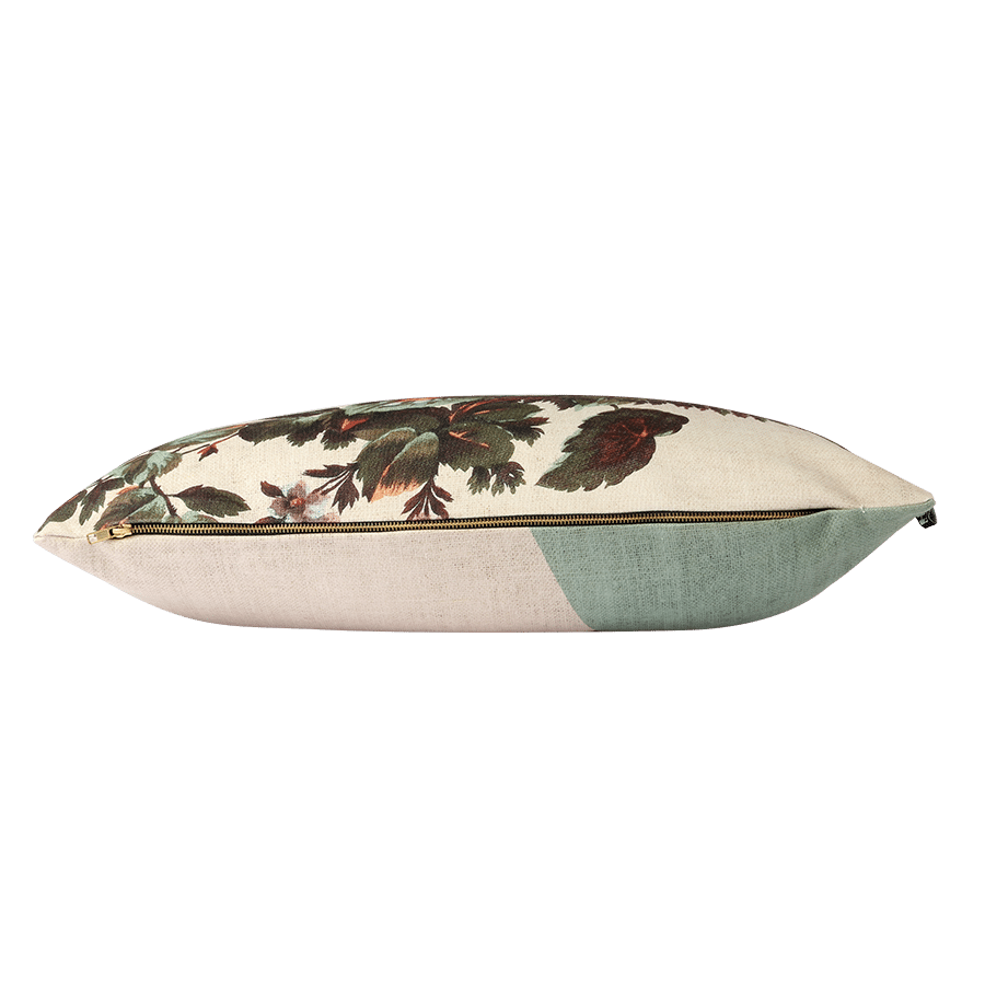 Gedrukt kussen geïnspireerd door Japanse invloeden. Het kussen heeft een bloemenprint aan de voorkant en een abstracte print aan de achterkant. Messing ritssluiting. 100% gerecycled PET-materiaal.
